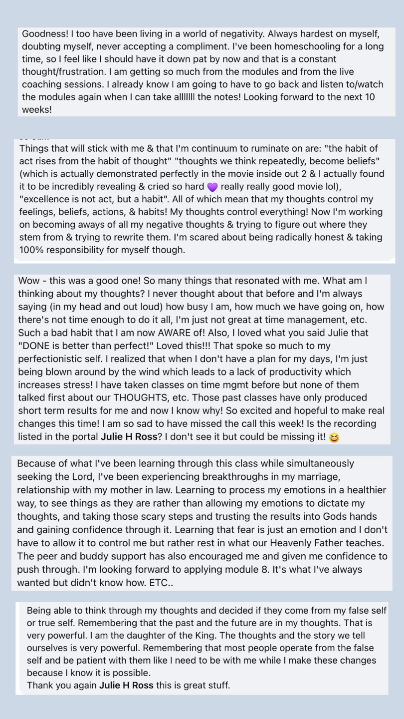 This course has honestly been better than therapy for me! Your teaching on emotions was so incredibly powerful& felt to me like it was ordained by God just for me and my family. I think everyone needs to hear it!
